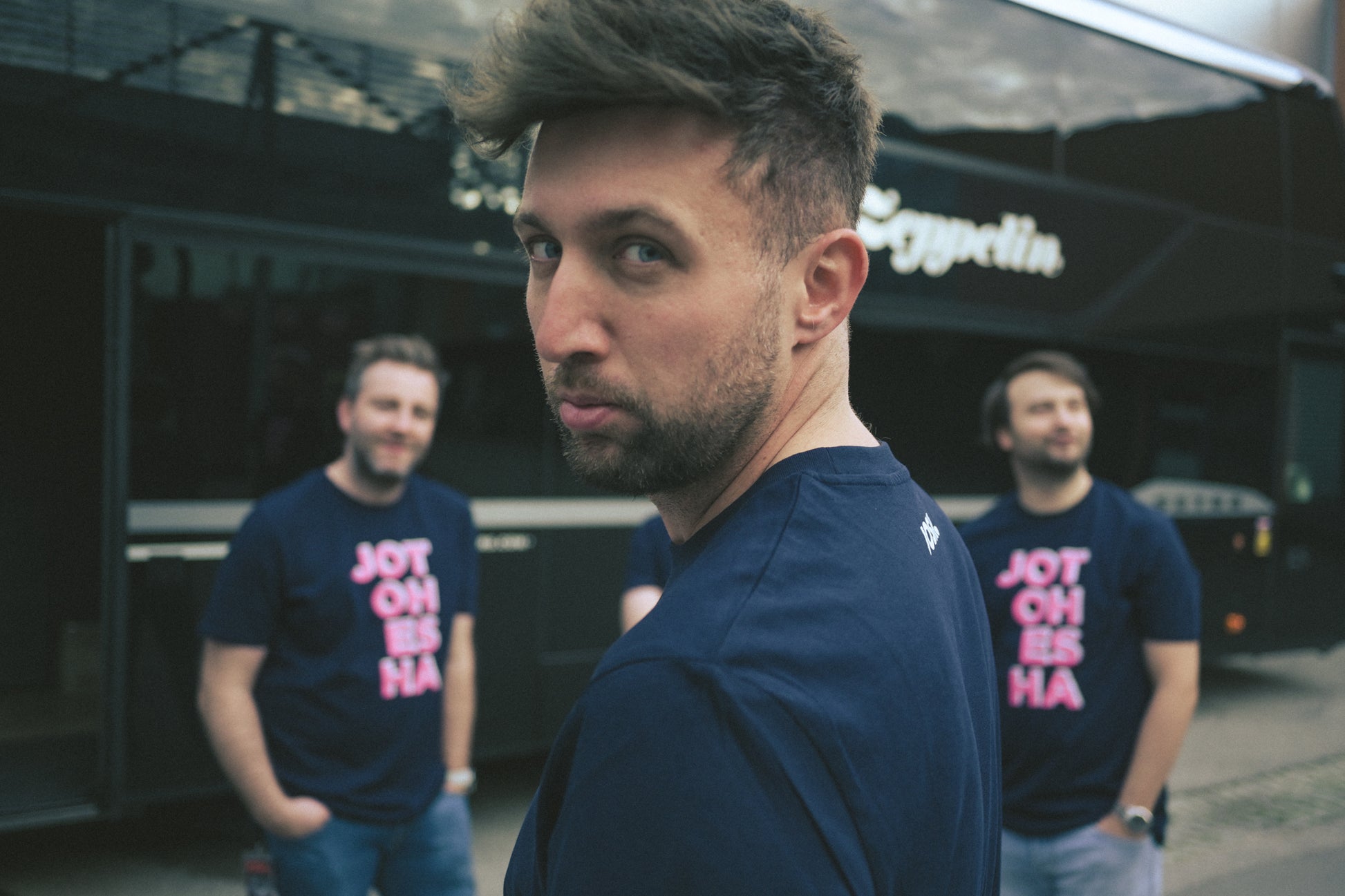 Die Rohware-Farbe ist dunkelblau/navy. Der Motiv-Print vorne zeigt den Text „JOT OH ES HA“ in knalligem Pink. Auf der Rückseite gibt es einen kleinen Nackenprint mit dem Josh.-Logo. Der Schriftzug ist jeweils im Siebdruckverfahren gedruckt.