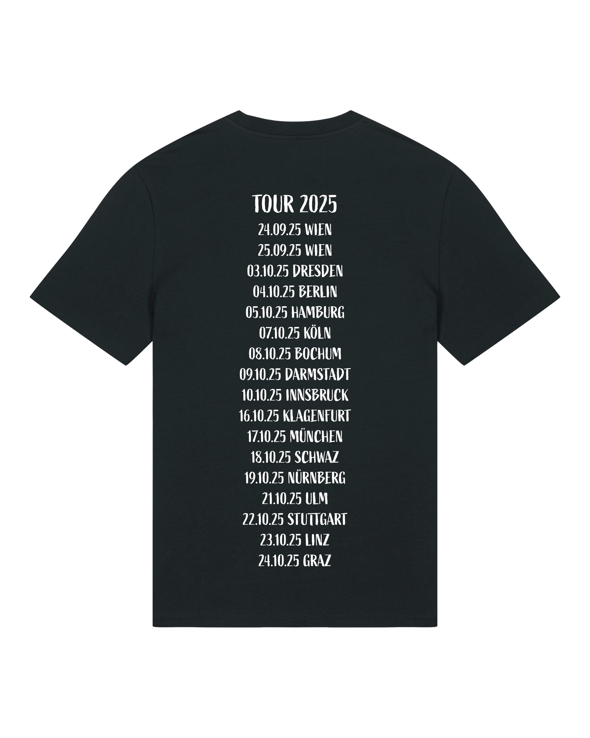Das Motiv - eine Live-Impression aus der Stadthalle 2024 - ist in weiß gehalten – auffällig vorne auf dem Shirt. Auf der Rückseite sind die Tourdaten der Herbsttour 2025 aufgelistet.
